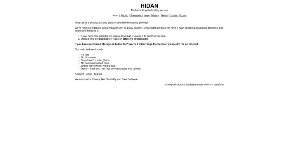 Descrição do site: O site Hidan se posiciona como um serviço simples, rápido e voltado à privacidade para hospedagem de arquivos. Ele não exige dados pessoais para cadastro, apenas um identificador alfanumérico de conta, e afirma não manter registros de logs de quem faz upload ou download. Os arquivos enviados não têm limite de tamanho declarado e não há tetos fixos de velocidade para transferência. O sistema adota uma política de expiração: arquivos expiram após dez dias sem downloads, mas cada download estende seu tempo em 30 minutos, até um limite máximo de buffer de 30 dias. Para uso mais permanente ou recursos extras, há planos pagos que permitem armazenamento permanente, customização de domínio e hotlinking. O site também informa que está sendo fundido com outro domínio (“buzzheavier.com”) como proxy, e que uploads serão desativados no domínio original. Em termos de confiabilidade, há avaliações positivas moderadas em serviços de verificação online, embora existam relatórios de comportamento suspeito em links específicos analisados em ambientes de sandbox. No geral, Hidan.sh combina uma abordagem minimalista, foco em anonimato e flexibilidade de uso, mas com riscos inerentes a serviços que funcionam sem registros e com domínios migratórios.
