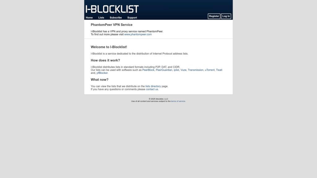 Descrição do site: O site I‑Blocklist oferece um serviço voltado para a distribuição de listas de endereços IP, disponibilizando formatos como P2P, DAT e CIDR, que podem ser integrados a softwares servidores ou clientes (como PeerBlock, uTorrent, Transmission etc.). Ele também mantém um serviço de VPN e proxy chamado PhantomPeer. Ao acessar, o usuário pode explorar as listas disponíveis na seção “Lists”, além de se inscrever para obter acesso completo e entrar em contato para dúvidas ou suporte. A plataforma funciona como um recurso técnico para administradores e usuários avançados que desejam filtrar ou bloquear tráfego de IPs indesejados. Todo uso do conteúdo e dos serviços oferecidos está condicionado aos termos de serviço do site.