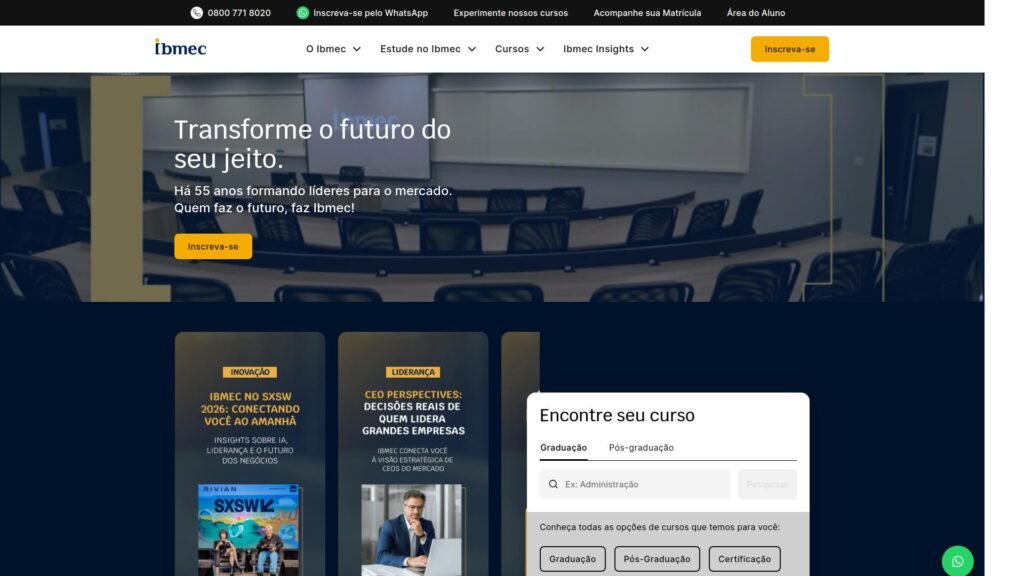 Descrição do site: O site do Ibmec apresenta uma instituição de ensino superior reconhecida pela excelência na formação em áreas como negócios, economia, direito e tecnologia. A plataforma reúne informações sobre seus cursos de graduação, pós-graduação, MBAs e programas executivos, voltados ao desenvolvimento acadêmico e profissional. Fundado em 1970, o Ibmec possui unidades em importantes cidades brasileiras e é referência na educação voltada ao mercado. O site destaca uma proposta educacional alinhada às demandas do mundo corporativo, com foco na aplicação prática do conhecimento e na formação de líderes preparados para desafios reais. Os cursos abrangem áreas como administração, finanças, engenharia, marketing e relações internacionais, oferecendo uma formação ampla e estratégica. Outro ponto relevante é a oferta de diferentes modalidades de ensino, incluindo cursos presenciais, híbridos e online, além de programas de curta duração voltados à atualização profissional. A plataforma também evidencia o contato com professores experientes e atuantes no mercado, promovendo aprendizado conectado à realidade das empresas. Além disso, o site ressalta a importância do networking, da inovação e do desenvolvimento de habilidades práticas, incentivando a construção de carreiras sólidas. Com um portfólio diversificado e foco em resultados, o Ibmec se posiciona como uma instituição que busca transformar conhecimento em oportunidades e impulsionar o crescimento profissional de seus alunos.