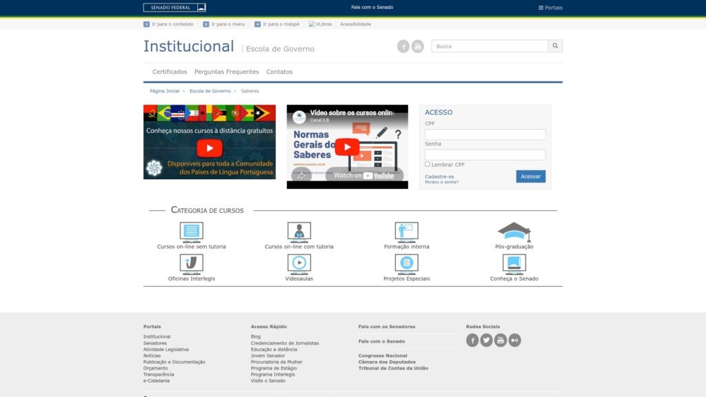 Descrição do site: O site do Instituto Legislativo Brasileiro (ILB), funciona como um ambiente virtual de aprendizagem voltado à oferta de cursos gratuitos a distância para a população e servidores públicos. A plataforma é baseada no sistema Moodle e reúne diversos cursos nas áreas de administração pública, direito, cidadania, política e gestão, com foco em capacitação e educação continuada. Nesse ambiente, os usuários podem acessar conteúdos, realizar atividades, acompanhar o desempenho e obter certificados ao final dos cursos concluídos. O site apresenta uma estrutura simples e funcional, permitindo o cadastro de novos usuários e a inscrição em cursos de forma prática e acessível. Os cursos podem ser realizados com ou sem tutoria, oferecendo diferentes formatos de aprendizado conforme a necessidade do participante. Além disso, a plataforma possibilita a interação entre alunos, tutores e coordenadores, criando um espaço colaborativo de ensino online. Outro destaque é o fato de todos os cursos serem gratuitos, ampliando o acesso ao conhecimento e contribuindo para a qualificação profissional e cidadã. O conteúdo é voltado tanto para quem deseja aprimorar conhecimentos específicos quanto para aqueles interessados em compreender melhor o funcionamento do setor público e das instituições democráticas. Dessa forma, o Instituto Legislativo Brasileiro se consolida como uma iniciativa educacional pública que promove inclusão, capacitação e disseminação de conhecimento no Brasil.