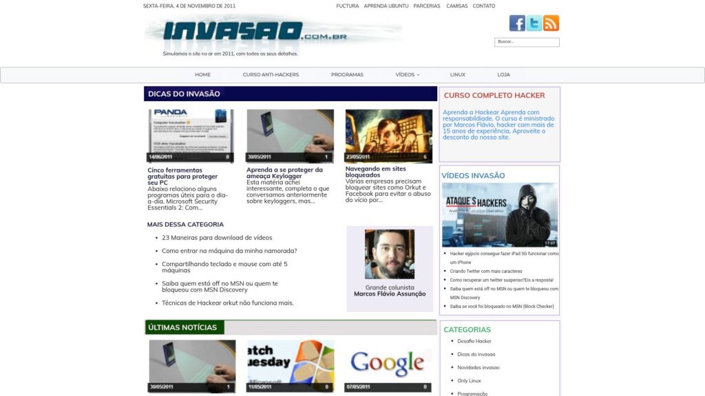 Descrição do site: O site Invasão funciona como um repositório histórico de conteúdos voltados à comunidade hacker e à segurança da informação — na versão atualmente disponibilizada, ele “simula o site no ar em 2011”, mantendo seu acervo original como um registro de época. O portal reúne artigos, tutoriais e dicas sobre segurança de computadores, proteção de sistemas, alertas sobre vírus, trojans e keyloggers, além de instruções de uso de ferramentas, métodos de defesa e conceitos técnicos para curiosos e entusiastas. Também havia seções específicas como “Dicas do Invasão”, “Segurança”, “Only Linux”, “Tutoriais”, “Programação” e “Vídeos”, organizando o conteúdo por categorias para facilitar o acesso. No passado, o site contava com iniciativas como o “Desafio Hacker”, um conjunto de exercícios práticos em ambientes Windows e Linux, voltados a estimular o raciocínio e o aprendizado prático — algo que revela uma ambição de ensino e de envolvimento ativo da comunidade. Apesar disso, o site foi descontinuado em 2011, e o que se vê hoje é uma “reprodução” da versão antiga como arquivo, sem atualizações recentes. Em essência, o site Invasão hoje funciona como um retrato de uma época da cultura hacker no Brasil — um acervo digital que documenta temas de segurança, hacking e tecnologia, com suas peculiaridades de linguagem, abordagem e mentalidade do início dos anos 2000.