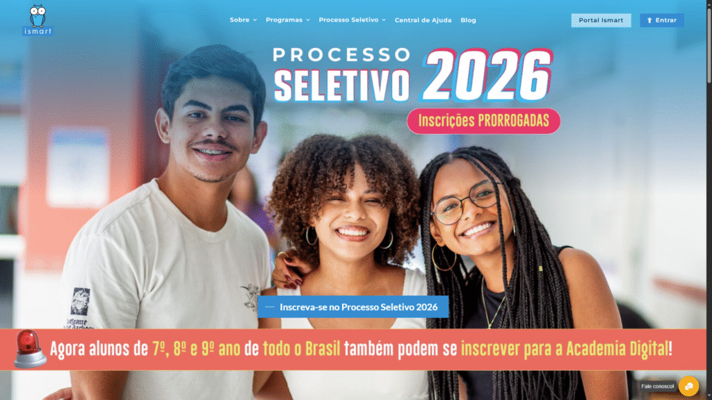 Descrição do site: O site do Ismart apresenta-se como uma iniciativa do Instituto Social para Motivar, Apoiar e Reconhecer Talentos, organização sem fins lucrativos que seleciona jovens de famílias de baixa renda entre os anos finais do ensino fundamental para oferecer bolsas integrais e oportunidades educacionais de excelência. Através de programas como Ismart Online, Alicerce, Academia Digital e Bolsa Talento, a instituição disponibiliza cursos preparatórios (em português, matemática e redação), formações socioemocionais, encontros virtuais e presenciais, além de auxílio para transporte, alimentação, uniforme e material didático para os beneficiados. O processo seletivo inclui etapas como inscrição online, prova digital, avaliação socioeconômica, entrevistas e desafios, e se aplica a estudantes residentes em certas cidades brasileiras. A plataforma valoriza o desenvolvimento global dos participantes — acadêmico, tecnológico e pessoal — com mentorias e comunidades de aprendizagem. O Ismart está presente em diversas capitais e regiões metropolitanas, e mantém compromisso de longa data com o impacto social por meio da educação, investindo na formação de jovens até a universidade.