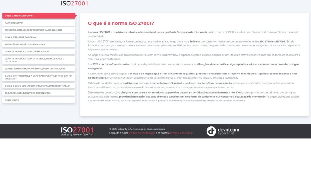 Descrição do site: O site ISO 27001 funciona como um portal informativo dedicado à norma ISO/IEC 27001 — padrão internacional de referência para sistemas de gestão da segurança da informação. Ele explica de forma clara o que é a norma — seus objetivos, requisitos e a lógica por trás da implementação — e detalha para que serve, enfatizando a necessidade de proteger dados, ativos e processos críticos com uma abordagem holística que considera pessoas, tecnologia e práticas organizacionais. A versão 2022 da norma é abordada, com destaque para suas principais mudanças, como novos controles e reorganização da estrutura normativa, o que demonstra a preocupação do site em manter a informação atualizada. Além disso, o site descreve os benefícios de adotar a norma — desde o fortalecimento da segurança e da confiabilidade da informação até ganhos de governança, conformidade regulatória e maior confiança de clientes e parceiros. Ele também aborda o processo de migração da versão anterior (2013) para a 2022, orientando organizações sobre como adequar seus Sistemas de Gestão de Segurança da Informação (SGSI) às novas exigências. Por fim, o site não apenas informa sobre a norma, mas também representa um canal de oferta de consultoria técnico-especializada por parte da Devoteam Cyber Trust para auxiliar empresas na implementação, auditoria e adoção plena da ISO 27001 — oferecendo apoio prático desde a preparação até a certificação, com base em experiência certificada.