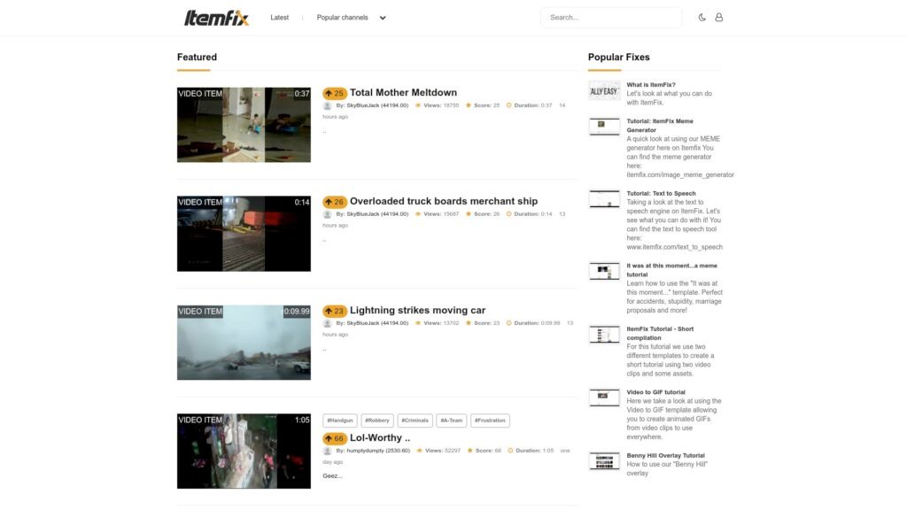 Descrição do site: O site ItemFix se apresenta como uma espécie de “fábrica social de vídeos”, onde usuários podem enviar e editar diversos tipos de mídia — vídeos, imagens e áudios — transformando-os em criações originais chamadas de “fixes”. Ao contrário de plataformas marcadas por conteúdo chocante, ItemFix enfatiza um ambiente mais moderado, proibindo publicações com violência extrema ou cenas sangrentas. A criação de um fix é simples e intuitiva: após carregar um conteúdo (“item”), o usuário pode aplicar templates como memes, GIFs, legendas, sobreposições com efeitos visuais, organizar elementos na linha do tempo e compartilhar ou baixar o resultado final. A interface traz conteúdo popular e recente em destaque — de falhas e memes a notícias virais, com categorias como “Viral”, “Memes”, “WTF”, “Fail” e mais, o que reforça o caráter dinâmico e voltado à cultura pop e à criatividade espontânea. O fundador de LiveLeak posicionou o ItemFix como uma evolução pensada para ser mais acessível e administrável, substituindo uma era marcada por conteúdos controversos por uma de criação digital mais leve e divertida. Em síntese, ItemFix funciona como uma plataforma colaborativa para produção expressiva de vídeos curtos e criativos, ideal para quem busca transformar clipes, imagens ou áudios em conteúdos compartilháveis com um estilo vibrante, acessível e moderado — perfeito para redes sociais e digital storytelling.