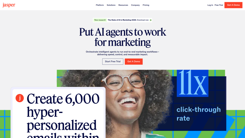 Descrição do site: O site Jasper é a página oficial de uma plataforma de inteligência artificial voltada à criação e automação de conteúdo, focada especialmente em atender equipes de marketing, redatores e empresas que precisam produzir textos com mais rapidez e consistência. Ele utiliza modelos avançados de linguagem para gerar diversos formatos de conteúdo — de posts de blog e descrições de produtos a e-mails, scripts e textos para redes sociais — com templates e fluxos personalizados que ajudam a manter o tom de voz da marca e alinhar mensagens às diretrizes internas. A ferramenta também oferece recursos de colaboração em equipe, geração de campanhas completas a partir de um único briefing, adaptação de estilo e SEO, e suporte a múltiplos idiomas para público global. A interface inclui um workspace chamado Canvas, agentes automatizados e um hub de conhecimento (Jasper IQ) para integrar dados e diretrizes de marca aos conteúdos gerados. A proposta central é acelerar a produção de conteúdo de alta qualidade, reduzir trabalho manual repetitivo e melhorar a eficiência em fluxos editoriais e campanhas de marketing, com opções de teste gratuito e planos pagos que ampliam funcionalidades.