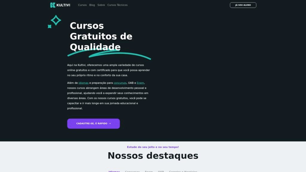 Descrição do site: O site Kultivi apresenta uma plataforma digital de ensino a distância voltada à oferta de cursos gratuitos com certificado, com foco no desenvolvimento pessoal e profissional. A proposta central do ambiente é democratizar o acesso à educação de qualidade, permitindo que qualquer pessoa estude online, no seu próprio ritmo e sem custos. A plataforma reúne uma grande variedade de cursos em áreas como idiomas, carreira, negócios, tecnologia e preparação para exames como ENEM e OAB. O site destaca uma metodologia baseada em videoaulas, materiais complementares e acesso ilimitado aos conteúdos, oferecendo flexibilidade para diferentes perfis de estudantes. Além disso, todos os cursos disponibilizam certificado de conclusão gratuito, o que agrega valor ao currículo dos usuários. Outro ponto relevante é o alcance da plataforma, que já reúne milhões de alunos e milhares de aulas disponíveis, consolidando sua presença no segmento de educação online no Brasil. A navegação é simples e organizada por categorias, facilitando a busca por cursos específicos e trilhas de aprendizado. O site também reforça sua missão como edtech, buscando tornar o conhecimento acessível a todos, independentemente de condição financeira ou localização. Dessa forma, a Kultivi se posiciona como uma alternativa prática e inclusiva para quem deseja adquirir novas habilidades e ampliar oportunidades por meio da educação digital.