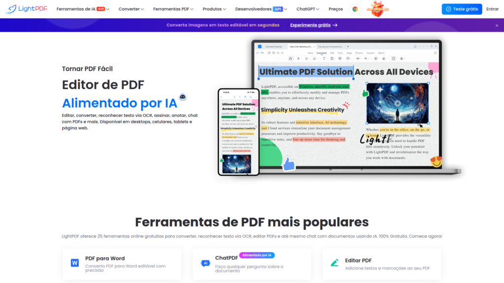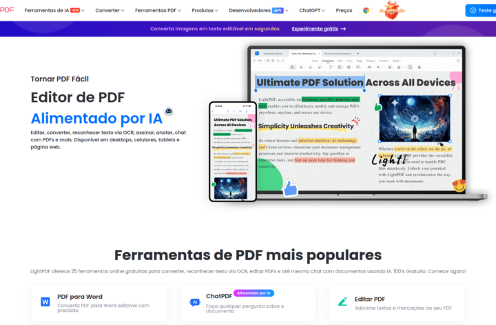 Descrição do site: O site LightPDF é uma plataforma online alimentada por inteligência artificial para edição, conversão e gerenciamento de arquivos PDF diretamente no navegador, oferecendo uma vasta gama de ferramentas para trabalhar com documentos sem necessidade de instalar software extra. Ele permite editar textos e imagens em PDFs, converter arquivos para e a partir de formatos como Word, Excel, PowerPoint e imagens, além de combinar, dividir, comprimir e proteger documentos com assinaturas digitais ou senhas. A plataforma também inclui OCR para transformar PDFs digitalizados em texto editável e recursos de chat com IA que respondem perguntas, resumem e extraem informações diretamente de documentos carregados. Usuários podem ainda anotar, destacar e colaborar em arquivos, sincronizar documentos na nuvem e acessar funções básicas gratuitamente ou planos pagos para capacidades expandidas. O serviço é compatível com múltiplos dispositivos — desktop, celular e tablet — e se posiciona como uma solução completa para facilitar fluxos de trabalho com PDFs em contextos pessoais, educacionais e profissionais, integrando tanto funcionalidades clássicas de PDF quanto ferramentas inteligentes para produtividade.