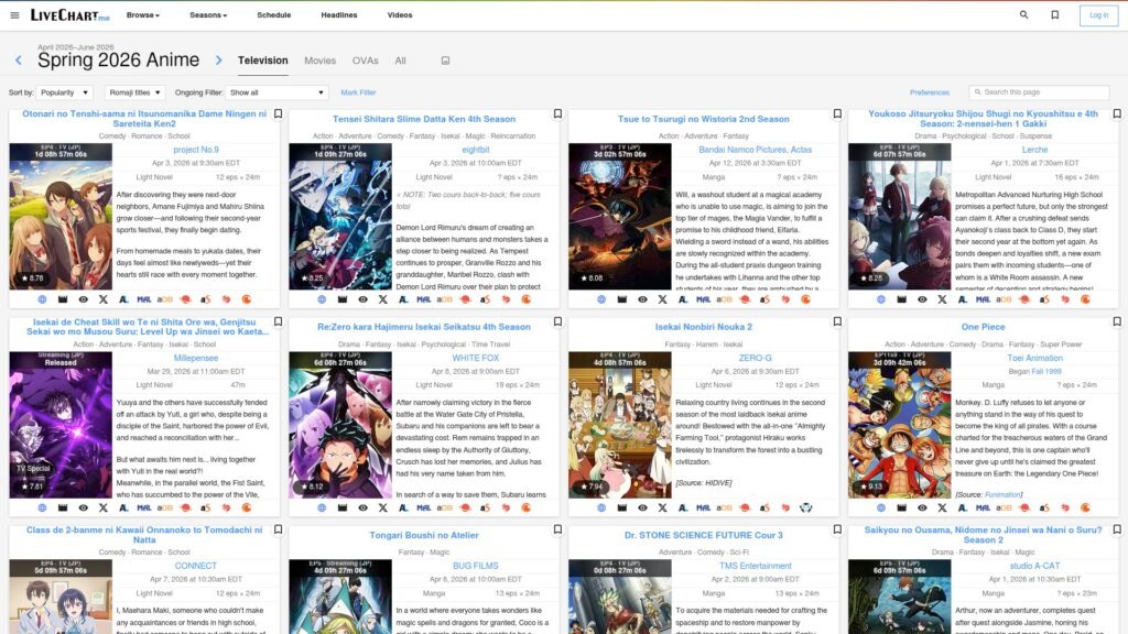 Descrição do site: O site LiveChart é uma plataforma online dedicada a acompanhar lançamentos de animes em tempo real, funcionando como um guia atualizado das temporadas e episódios que estão sendo exibidos. Sua principal proposta é organizar os animes por temporada, exibindo listas com datas de estreia, horários de transmissão e informações detalhadas sobre cada título, o que facilita para o usuário acompanhar o calendário de lançamentos. A interface é bastante intuitiva, apresentando os animes em formato de grade visual com capas e dados essenciais, permitindo navegar rapidamente entre diferentes temporadas e gêneros. Além disso, o site oferece um sistema de cronograma diário, onde é possível visualizar exatamente quando cada episódio será lançado, tornando-se útil para quem acompanha séries semanais. Outro recurso relevante é a possibilidade de criar uma conta para marcar animes favoritos e acompanhar o progresso, além de receber notificações sobre novos episódios. A plataforma também indica onde determinados animes podem ser assistidos legalmente em serviços de streaming, ampliando sua utilidade prática. O LiveChart também incorpora avaliações, comentários e interações da comunidade, ajudando usuários a descobrir novos títulos com base na popularidade e opinião de outros fãs. Com foco em atualização constante e organização clara das informações, o site se tornou uma referência para quem deseja se manter informado sobre o universo dos animes.