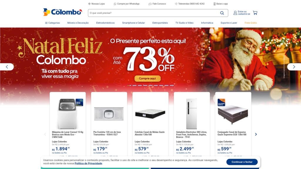 Descrição do site: Site da loja online oficial das Lojas Colombo, uma rede varejista brasileira tradicional com presença física principalmente no Sul do país e atuação no comércio de eletrônicos, eletrodomésticos, móveis, utilidades domésticas e outros produtos para o lar. A plataforma oferece um catálogo variado, permitindo ao usuário navegar por categorias de produtos, conferir descrições, preços e opções de pagamento antes de efetuar a compra, além de integrar serviços como acompanhamento de pedido e suporte ao cliente. Apesar de ser um site legítimo associado a uma empresa com décadas de história no varejo brasileiro, avaliações de experiência de compra em plataformas de consumidores indicam uma reputação considerada regular, o que sugere atenção na hora de comprar ou se cadastrar. O design é focado em facilitar a busca e a comparação de produtos, com destaque para ofertas e facilidades como parcelamento e canais de atendimento como telefone, WhatsApp e formulário de contato. Em resumo, o site das Lojas Colombo funciona como um e-commerce tradicional que busca levar a experiência de compra física para o ambiente digital, com um mix amplo de produtos e serviços voltados ao consumidor final.