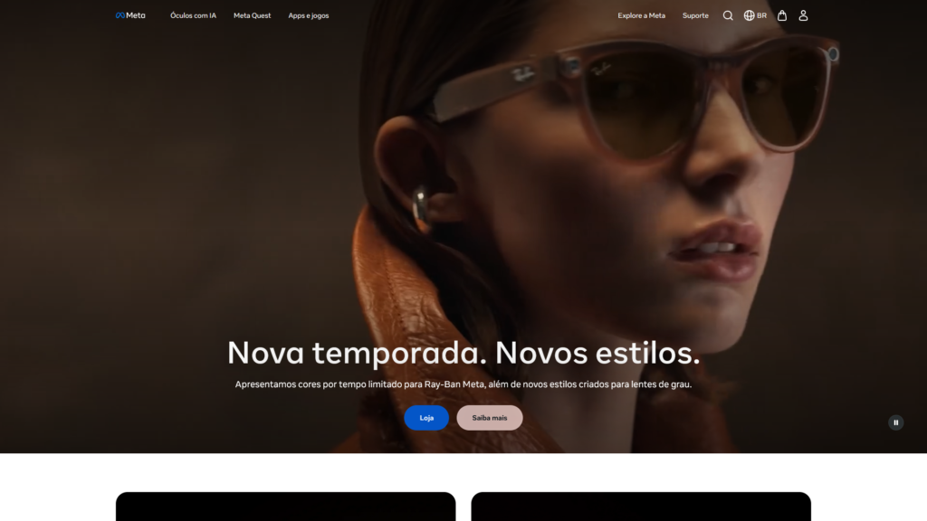 Descrição do site: O site da Meta é a plataforma institucional e comercial da empresa global de tecnologia responsável por serviços como Facebook, Instagram e WhatsApp, reunindo informações sobre seus produtos, soluções e inovações digitais. A página apresenta o ecossistema da empresa, destacando ferramentas voltadas para comunicação, redes sociais, realidade virtual e o desenvolvimento do chamado metaverso. Além disso, o site também funciona como uma vitrine para produtos tecnológicos, como dispositivos de realidade virtual (linha Meta Quest), e soluções voltadas para criadores, empresas e anunciantes. A plataforma oferece acesso a recursos como Meta Ads, ferramentas de negócios e integrações para quem deseja utilizar as redes sociais de forma profissional. Outro ponto importante é a presença de conteúdos institucionais, incluindo informações sobre a empresa, suas iniciativas em inteligência artificial, privacidade, segurança e impacto global. O site também destaca novidades, lançamentos e atualizações constantes dos serviços e tecnologias desenvolvidas pela Meta. A interface é moderna e visualmente orientada, com navegação intuitiva que direciona o usuário para produtos, soluções empresariais e conteúdos informativos. No geral, o site funciona como um hub central da Meta, conectando usuários, desenvolvedores e empresas a um amplo conjunto de plataformas digitais e experiências tecnológicas integradas.
