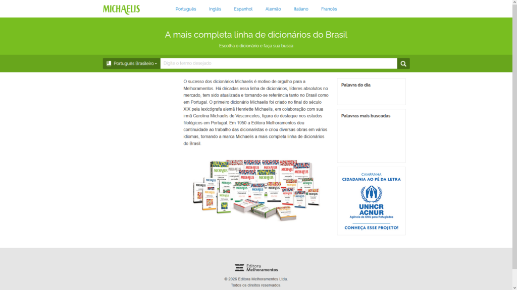 Descrição do site: O site Michaelis é a versão digital do tradicional Dicionário Michaelis, uma obra lexicográfica brasileira clássica mantida pela Editora Melhoramentos e disponibilizada em parceria com o portal UOL. Nele é possível pesquisar rapidamente definições, informações gramaticais e traduções, consultando verbetes em várias línguas como português, inglês, espanhol, francês, alemão e italiano, tudo organizado para facilitar o uso cotidiano e o estudo de vocabulário. O conteúdo reflete décadas de tradição editorial com milhares de verbetes atualizados conforme as normas atuais da língua, incluindo divisão silábica, classes gramaticais e exemplos de uso contextual. A interface do site prioriza uma busca simples e direta, adequada tanto para consultas rápidas quanto para estudo mais aprofundado de termos ou expressões. Ao longo dos anos, o Michaelis se consolidou como referência para estudantes, escritores e profissionais que precisam de informações linguísticas confiáveis, aproveitando a presença online para ampliar o acesso às suas definições.