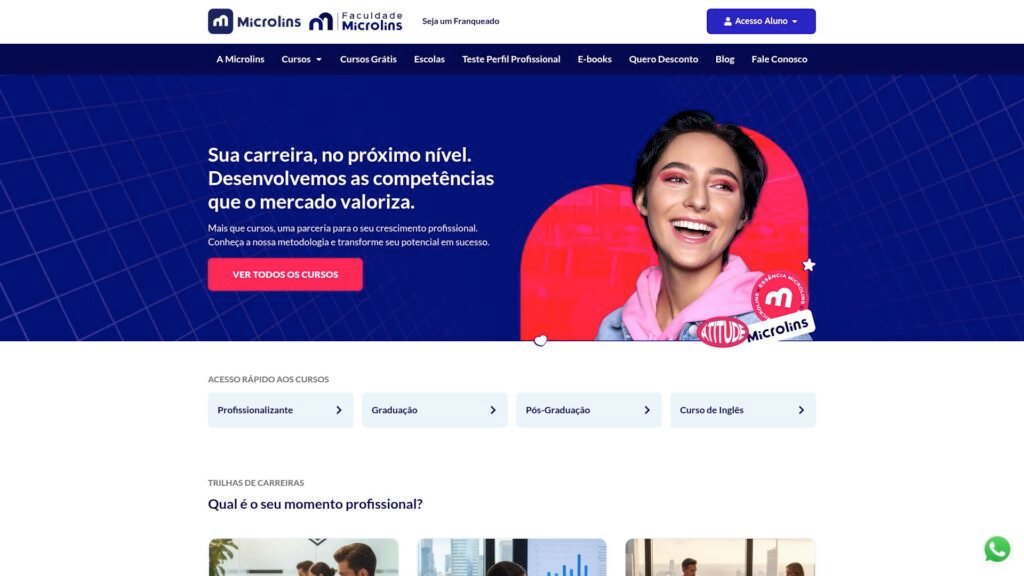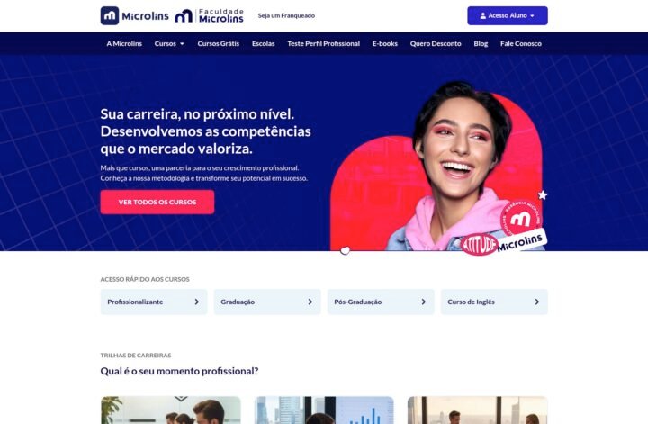 Descrição do site: O site da Microlins apresenta uma plataforma educacional voltada à qualificação profissional, com foco no desenvolvimento de competências práticas exigidas pelo mercado de trabalho. A página destaca a proposta de impulsionar carreiras por meio de cursos acessíveis tanto para iniciantes quanto para quem busca crescimento profissional. A instituição, fundada em 1991, possui ampla presença no Brasil, com centenas de unidades e atuação consolidada no segmento de cursos profissionalizantes. O site organiza seus conteúdos em trilhas de carreira, permitindo que o usuário escolha formações de acordo com seu momento profissional, como primeiro emprego, promoção ou liderança. Entre os cursos oferecidos estão áreas como tecnologia, marketing, administração, saúde e idiomas, além de capacitações específicas como desenvolvimento de aplicativos, design gráfico e inteligência artificial. Outro destaque é a metodologia de ensino, que enfatiza a prática desde o início, combinando teoria com aplicação real para facilitar o aprendizado. A plataforma também valoriza o desenvolvimento de habilidades comportamentais, como comunicação, liderança e inteligência emocional, consideradas diferenciais no mercado atual. De forma geral, o site posiciona a Microlins como uma parceira na formação profissional, oferecendo cursos presenciais e online com foco em empregabilidade, crescimento contínuo e preparação para os desafios do mundo do trabalho.