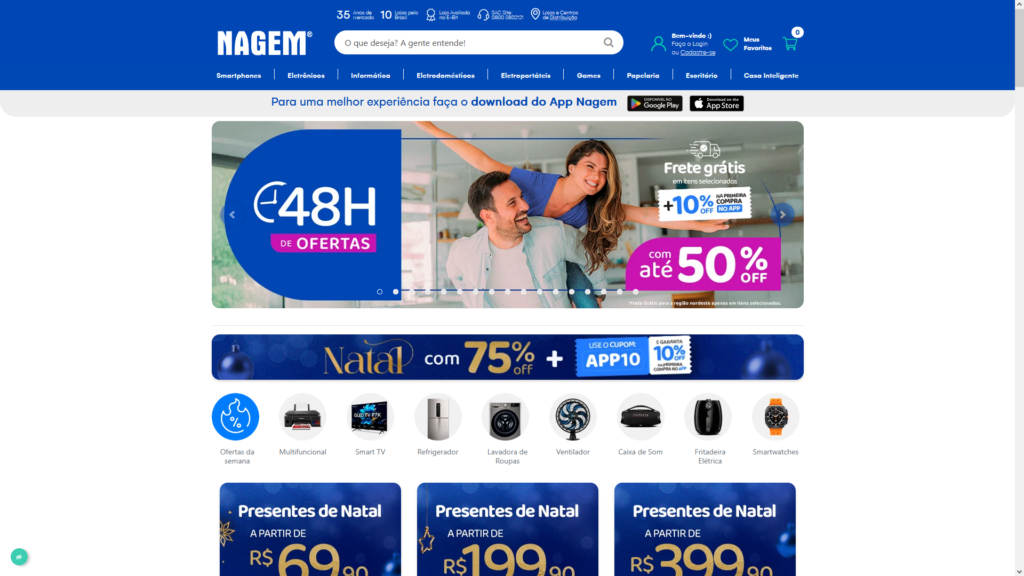 Descrição do site: E-commerce oficial da Nagem, uma rede varejista brasileira de tecnologia com forte presença física e online, conhecida pelo slogan “A gente entende. A gente vende.” e com atuação em segmentos como informática, telefonia, eletrônicos, games, eletrodomésticos e papelaria. No site são exibidos milhares de produtos de diversas marcas com ofertas, promoções e opções de pagamento parcelado, além de informações sobre políticas de troca, entrega e atendimento ao cliente. A plataforma integra o varejo online às operações físicas da empresa, que possui lojas e centros de distribuição em várias cidades do Brasil, facilitando compras tanto para consumidores finais quanto para clientes corporativos. Com histórico de mais de 30 anos no mercado e um extenso portfólio, a Nagem busca oferecer variedade e competitividade em tecnologia e utilidades para o lar e o escritório, com destaque a preços e campanhas semanais. O site usa conexão segura (HTTPS) e representa um dos principais canais de compra da marca, servindo como vitrine digital para produtos e serviços voltados à tecnologia e eletrônicos.