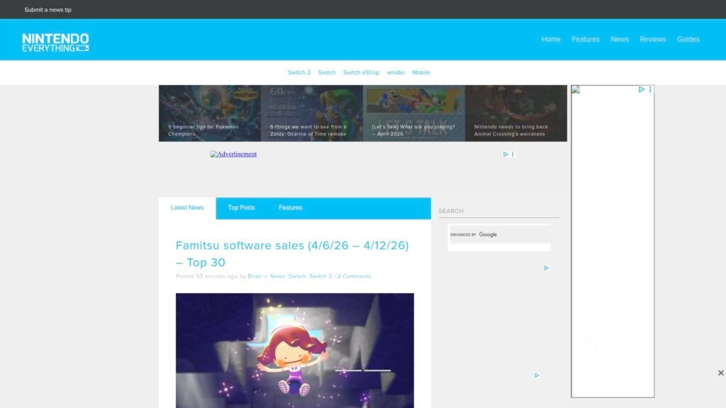 Descrição do site: O site Nintendo Everything é um portal de notícias especializado no universo da Nintendo, funcionando como uma fonte contínua de informações sobre jogos, consoles e serviços da empresa. A plataforma publica conteúdos diariamente, incluindo novidades, anúncios, atualizações, trailers e rumores relacionados a títulos do Nintendo Switch e outras plataformas da marca. O site também oferece análises, guias e artigos de opinião, abordando temas relevantes para a comunidade gamer e aprofundando discussões sobre franquias e tendências do mercado. Além disso, cobre eventos, lançamentos e mudanças importantes no ecossistema Nintendo, mantendo os leitores atualizados em tempo real. A navegação é organizada por categorias como notícias, reviews, guias e conteúdos especiais, facilitando o acesso às informações mais recentes e populares. Outro destaque é a frequência de atualização, com novas postagens ao longo do dia, o que torna o site uma referência para acompanhar novidades rapidamente. O portal também reúne conteúdos sobre jogos mobile, eShop, amiibo e serviços online, ampliando a cobertura para além dos consoles tradicionais. Com mais de uma década de atuação, o site consolidou-se como uma fonte confiável dentro do segmento de notícias sobre Nintendo. No geral, o Nintendo Everything funciona como um hub informativo dedicado exclusivamente ao universo Nintendo, oferecendo notícias atualizadas, conteúdos especializados e cobertura constante para fãs que desejam acompanhar tudo o que acontece no cenário da empresa.