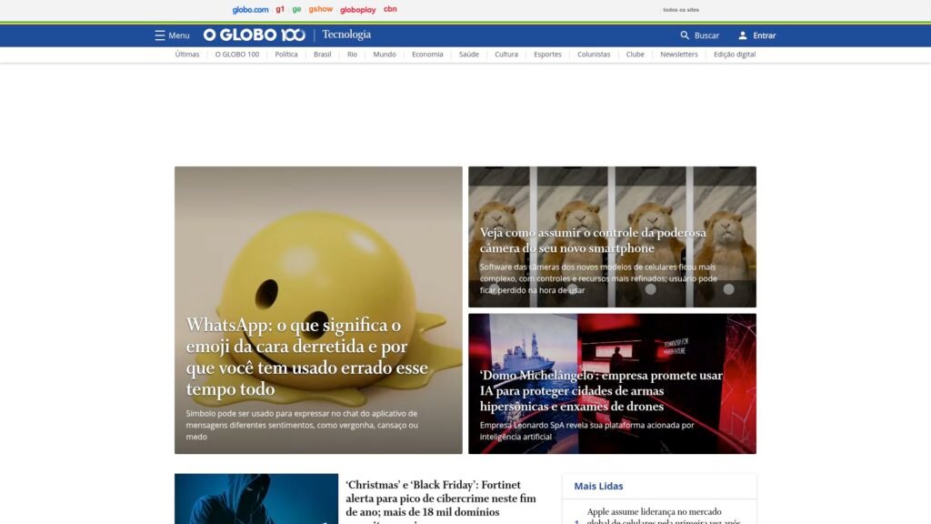 Descrição do site: O site O GLOBO — Tecnologia — funciona como uma fonte de informação atual sobre os impactos das inovações tecnológicas e seus reflexos na economia, negócios e sociedade. Ele publica reportagens sobre avanços em inteligência artificial, conectividade, segurança digital, transformações no mercado de trabalho e as consequências para empresas e consumidores. A cobertura combina atualidades — como decisões de grandes corporações globais ou regulamentações — com análises de tendências mais amplas, como adoção de 5G, Internet das Coisas (IoT), mudanças no setor de tecnologia e indústrias de alta tecnologia. O estilo editorial equilibra informação acessível com profundidade jornalística, voltada tanto para leitores leigos quanto para profissionais interessados em economia e tecnologia. Considerando a reputação de O GLOBO como um dos jornais mais lidos e confiáveis do Brasil, essa seção ganha relevância para quem busca entender como a tecnologia influencia o contexto econômico e social do país.