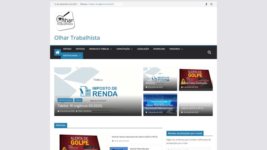 Descrição do site: O site Olhar Trabalhista se apresenta como um portal voltado a disponibilizar conteúdo informativo sobre legislação trabalhista, direitos do trabalhador, atualizações normativas e questões relativas a emprego no Brasil — com artigos, notícias, guias e materiais práticos que ajudam quem busca se orientar sobre contratos, FGTS, eSocial, cálculos de salário e obrigações trabalhistas. Além de textos explicativos, o site oferece também materiais complementares, como planilhas de cálculo previdenciário ou fiscal, para facilitar a compreensão e o acompanhamento de finanças e obrigações de empregados e empregadores. Há cursos — gratuitos ou com acesso facilitado — sobre temas como contratos de trabalho, cálculos trabalhistas e direitos trabalhistas, promovendo uma formação básica para quem quer entender melhor o sistema jurídico-laboral. O portal costuma atualizar-se de acordo com mudanças recentes em leis ou regulamentações, o que torna seu conteúdo útil para quem quer acompanhar as transformações do ambiente de trabalho e da legislação. Em suma, Olhar Trabalhista funciona como um guia acessível e prático para trabalhadores, empregadores ou interessados no tema, oferecendo um mix de artigos, ferramentas e cursos que visam esclarecer direitos e deveres no mundo do trabalho no Brasil.