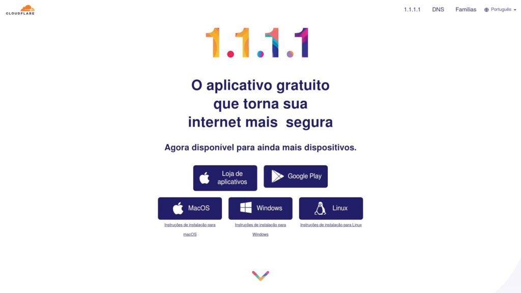 Descrição do site: O site One.One.One.One apresenta o serviço 1.1.1.1 da Cloudflare em versão em português, destacando que é um aplicativo gratuito que torna sua conexão com a internet mais segura. Ele explica que, embora os provedores possam monitorar seu tráfego, o 1.1.1.1 com WARP criptografa uma parte maior dos dados de saída do dispositivo para evitar espionagem. A página enfatiza que a privacidade é um direito e garante que os dados do usuário nunca serão vendidos. Também menciona que usuários WARP+ têm acesso a uma rede ampliada, diminuindo latência ao se aproximarem de data centers da Cloudflare. Mostra compatibilidade com várias plataformas — Android, iOS, macOS, Windows e Linux — e convida à instalação com instruções adequadas para cada sistema. A Cloudflare sustenta o projeto com infraestrutura robusta e destaca que o 1.1.1.1 já é um dos resolvedores DNS mais rápidos do mundo.