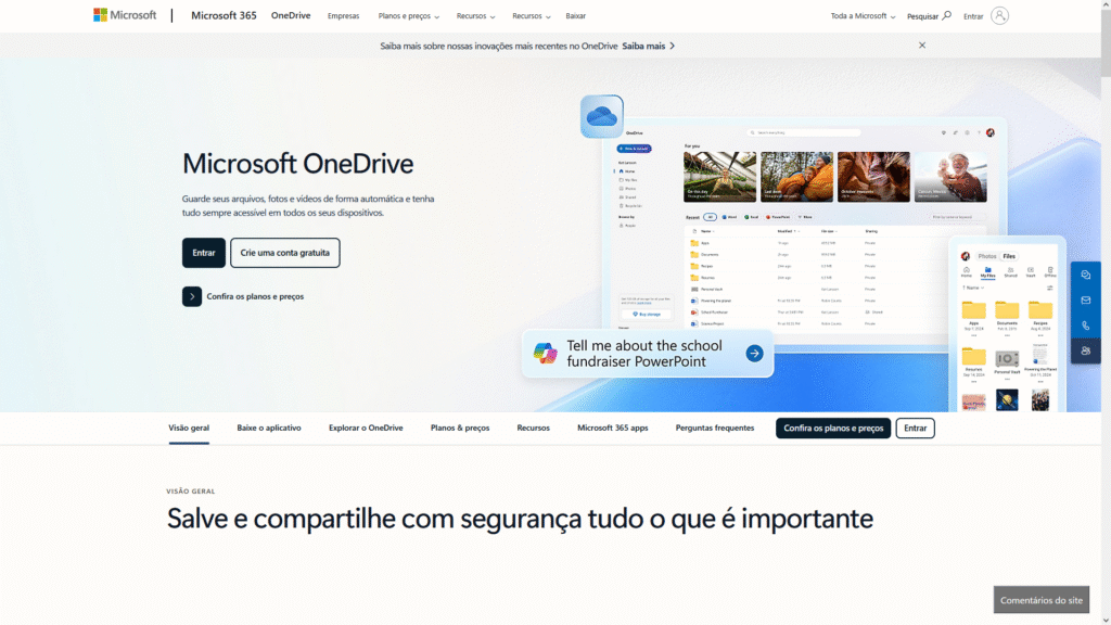Descrição do site: O OneDrive é o serviço de armazenamento em nuvem da Microsoft que permite guardar arquivos, fotos, vídeos e documentos de forma automática, acessível de qualquer dispositivo — computador, celular ou tablet — com sincronização que mantém tudo atualizado mesmo offline. Ele oferece um plano gratuito com 5 GB de espaço, enquanto planos pagos dentro do Microsoft 365 permitem capacidades muito maiores, chegando a múltiplos terabytes dependendo do plano, com recursos adicionais. Há também mecanismos de segurança reforçados — por exemplo o Cofre Pessoal, que exige autenticação extra para acessar arquivos sensíveis, proteção contra ransomware, versões de arquivos, links compartilhados com expiração e senha. A interface é integrada com aplicativos da Microsoft como Word, Excel, PowerPoint e Outlook, facilitando colaboração em tempo real, edição de documentos e backup de pastas do computador e do celular. O site destaca também ferramentas modernas como digitalização de documentos via aplicativo móvel, recuperação de arquivos em casos de perda ou ataque, e a novidade do uso de IA no Copilot para agilizar tarefas como resumos ou comparações de arquivos. O OneDrive também se apresenta como uma solução prática para quem já utiliza o ecossistema Microsoft, por permitir editar, compartilhar e colaborar de modo fluido entre plataformas, combinando produtividade, segurança e conveniência.