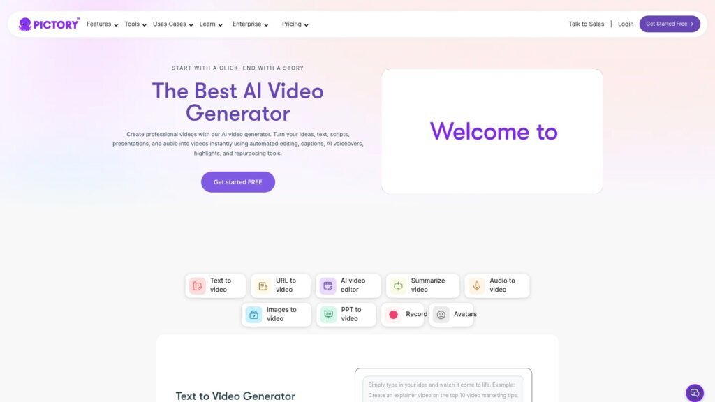 Descrição do site: O site Pictory é uma plataforma online de criação e edição de vídeos impulsionada por inteligência artificial que transforma textos, URLs, roteiros, áudios, imagens ou apresentações em vídeos profissionais de forma rápida e intuitiva, sem necessidade de conhecimento em softwares complexos. A ferramenta usa IA para estruturar conteúdo, selecionar visuais relevantes, adicionar narração com vozes geradas por IA e legendas automáticas, montando cenas coerentes e prontas para publicação em minutos. Além de gerar vídeos a partir de textos ou links, o Pictory permite editar vídeos existentes com transcrição automática, destacar trechos importantes e personalizar o resultado com elementos de marca, música e estilos visuais. Com foco em criadores de conteúdo, profissionais de marketing, educadores e equipes empresariais que buscam produzir vídeos eficientes sem grande esforço técnico, o site oferece workflows simplificados para transformar ideias em peças audiovisuais impactantes. A experiência é acessível tanto para iniciantes quanto para usuários experientes que desejam acelerar a produção de vídeos com ajuda da inteligência artificial.