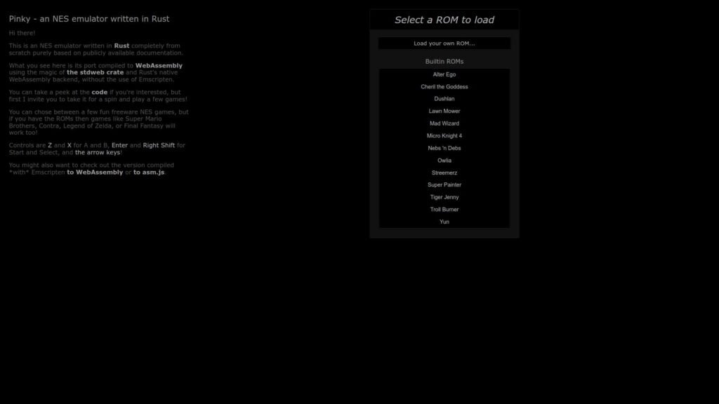 Descrição do site: O site hospeda o Pinky, um emulador de NES (Nintendo Entertainment System) escrito em Rust e compilado para WebAssembly, permitindo rodar jogos desse console clássico diretamente no navegador sem precisar instalar nada adicional. Ele oferece um campo para carregar um ROM de NES ou testar alguns jogos freeware inclusos, e usa teclas do teclado para simular os controles tradicionais, com comandos como Z/X para os botões A e B e as setas para direção. A página foi criada como uma demonstração prática de como um emulador completo pode funcionar em WebAssembly, aproveitando tecnologias web modernas para portar código Rust para o navegador. Ao carregar, o site mostra opções de seleção de ROM e mensagens de erro caso o navegador não suporte os recursos necessários, destacando sua dependência de compatibilidade com WebAssembly. A experiência é focada em nostalgia e desenvolvimento, oferecendo uma forma rápida de testar títulos clássicos de NES sem ferramentas externas.