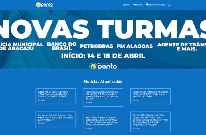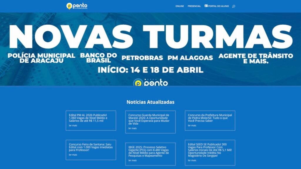 Descrição do site: O site Ponto dos Concursos é uma plataforma voltada à preparação de candidatos para concursos públicos, oferecendo conteúdos educacionais e informativos para quem busca ingressar no serviço público. O portal reúne cursos online, materiais em PDF, videoaulas e recursos didáticos que abordam diversas disciplinas cobradas em provas de concursos. Além dos cursos, o site também atua como um canal de atualização, publicando notícias frequentes sobre editais, vagas abertas, salários e oportunidades em diferentes regiões do Brasil. Essas informações ajudam os estudantes a se manterem informados sobre novos certames e prazos importantes. A plataforma oferece suporte ao aluno por meio de professores e fóruns de dúvidas, permitindo uma interação direta durante o processo de aprendizagem. Outro destaque é a disponibilização de cronogramas de estudo, aulas demonstrativas e materiais para download, facilitando a organização dos estudos. O site também apresenta diferenciais como garantia de satisfação inicial e conteúdos estruturados que combinam teoria e exercícios, buscando preparar o aluno de forma completa. Com uma proposta focada na aprovação, o Ponto dos Concursos se posiciona como uma alternativa para quem deseja estudar de maneira prática e direcionada para concursos públicos.