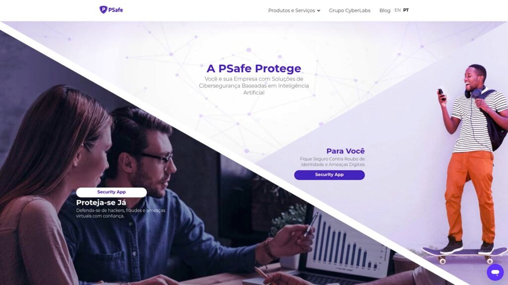 Descrição do site: O site da PSafe se apresenta como uma plataforma consolidada de cibersegurança, com foco em proteger privacidade, identidade e dispositivos contra ameaças digitais. Ele oferece o app dfndr security, que vai além de antivírus, incluindo proteção contra fraudes, roubo de identidade e invasões, além de ferramentas como o VScanner para detecção de vulnerabilidades. A PSafe destaca seu uso de inteligência artificial para identificar ameaças rapidamente, além de possuir uma base de dados muito ampla de credenciais roubadas (“credential stuffing”) e consultas antiphishing diárias. O site também enfatiza sua tradição no mercado latino-americano, oferecendo soluções tanto para usuários comuns quanto para empresas (B2C e B2B). A navegação é clara, com áreas dedicadas a “Produtos e Serviços”, blog, políticas de privacidade, e seção de suporte. Há transparência quanto ao uso de cookies, termos de uso e licenças. O layout transmite credibilidade, com estatísticas de instalações, volumes de ameaças detectadas e alcance global como argumentos de confiança.