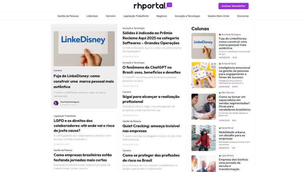 Descrição do site: O site RH Portal se define como o maior portal de conteúdo colaborativo sobre Recursos Humanos, Departamento Pessoal e Gestão de Pessoas da América Latina. Ele foi idealizado com o objetivo de concentrar em um só lugar artigos, ferramentas, notícias e materiais úteis para profissionais e estudantes da área de RH, oferecendo desde reflexões sobre gestão de pessoas até orientações práticas sobre carreira, legislação trabalhista, bem-estar no trabalho e inovação. O RH Portal publica com frequência conteúdos atuais sobre temas como jornadas de trabalho, saúde mental no trabalho, gestão de crises nas empresas, inteligência emocional, cultura organizacional e tendências de mercado — mostrando preocupação com a realidade corporativa contemporânea no Brasil. Ao longo dos anos, a plataforma foi construída como uma comunidade: permite interação entre profissionais, acesso a fornecedores e consultores, além de oferecer ferramentas de apoio como planilhas, calculadoras de indicadores de RH e recursos para uso cotidiano no departamento pessoal. Por ser mantida pela empresa Sólides, o site combina expertise técnica com foco prático, o que facilita o uso de seus conteúdos tanto por quem pesquisa quanto por quem atua diretamente com RH. De forma geral, o RH Portal se apresenta como um hub completo e acessível para quem busca se atualizar ou aprofundar conhecimentos sobre gestão de pessoas, carreira, compliance trabalhista e inovação no ambiente corporativo no Brasil.