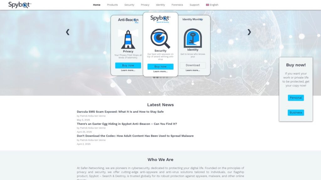 Descrição do site: O site Safer‑Networking é a casa do Spybot, uma suíte de ferramentas focadas em proteger sua identidade digital, privacidade e sistema contra malwares. Ele oferece produtos como o Spybot – Search & Destroy, Anti‑Beacon, Identity Monitor, entre outros utilitários para análise de arquivos, registro e rastreamento de navegação, tudo voltado para detectar e bloquear ameaças e reduzir rastros digitais. A página enfatiza grande compromisso com privacidade, informando que não armazena desnecessariamente os dados pessoais dos usuários e possibilita verificar se houve vazamentos de contas. Também há suporte, guias de remoção de malware, FAQs e notícias atualizadas sobre segurança. Visualmente limpo e direto, o site transmite confiança ao posicionar seus softwares como ferramentas maduras, desenvolvidas há duas décadas, com foco em defender tanto usuários domésticos quanto profissionais.