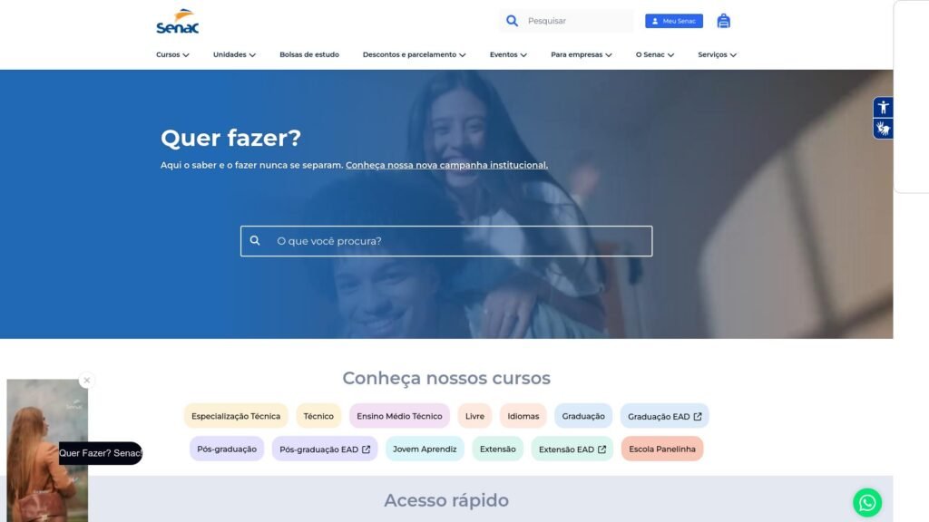 Descrição do site: O site Senac São Paulo é o portal oficial da unidade paulista do Serviço Nacional de Aprendizagem Comercial, voltado à divulgação de cursos, serviços educacionais e informações institucionais. A plataforma apresenta uma ampla oferta de formação profissional, incluindo cursos livres, técnicos, ensino médio técnico, graduação, pós-graduação e extensão, em diversas áreas do conhecimento como tecnologia, gestão, saúde, gastronomia e design. O site é organizado para facilitar a navegação do usuário, permitindo a busca por cursos por área, tipo ou modalidade, incluindo opções presenciais e a distância. Também disponibiliza informações sobre bolsas de estudo, programas de gratuidade e iniciativas voltadas à inclusão educacional, ampliando o acesso ao ensino de qualidade. Além da oferta acadêmica, o portal apresenta a proposta pedagógica da instituição, baseada no conceito de “aprender fazendo”, que valoriza atividades práticas, ambientes modernos e integração com o mercado de trabalho. O Senac São Paulo também destaca sua atuação com empresas, oferecendo soluções corporativas e formação de profissionais alinhados às demandas atuais. De forma geral, o site transmite a imagem de uma instituição consolidada e inovadora, com forte presença no estado de São Paulo, comprometida com a formação profissional, o desenvolvimento social e a empregabilidade dos seus alunos.