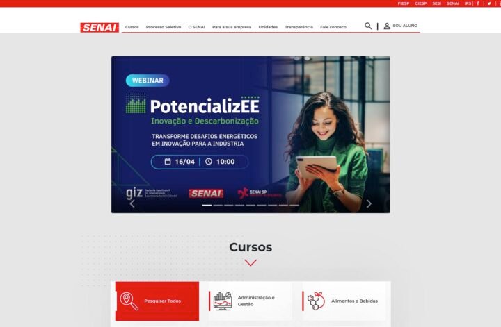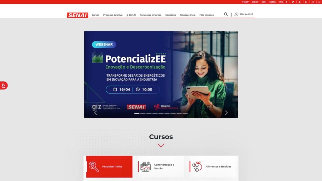 Descrição do site: O site SENAI-SP é a plataforma oficial da instituição voltada à educação profissional e tecnológica, com foco na formação de mão de obra qualificada para a indústria. O portal reúne uma ampla oferta de cursos presenciais e a distância, atendendo diferentes níveis de ensino, como cursos livres, técnicos, graduação, pós-graduação e programas de aprendizagem. A plataforma organiza seus cursos por áreas industriais e tecnológicas, incluindo segmentos como automotiva, construção civil, tecnologia da informação, mecânica, logística, energia e design, permitindo ao usuário filtrar opções conforme interesse e localização. O site também destaca oportunidades de cursos gratuitos e iniciativas voltadas à inovação, como projetos com startups e programas ligados à indústria 4.0, inteligência artificial e sustentabilidade. Além da oferta educacional, o portal apresenta notícias, pesquisas e conteúdos institucionais que mostram a atuação do SENAI-SP no desenvolvimento tecnológico e no apoio às empresas industriais. A navegação é estruturada para facilitar a busca por unidades, turmas disponíveis e informações detalhadas sobre cada curso. Com uma proposta voltada à prática e à empregabilidade, o site se posiciona como uma referência nacional na formação técnica e profissional, conectando educação, inovação e demandas do mercado de trabalho.
