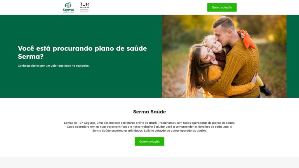 Descrição do site: O site da Serma Saúde funciona como uma página voltada à captação de interessados em planos de saúde, apresentando opções acessíveis e incentivando o usuário a solicitar uma cotação personalizada. A plataforma destaca benefícios como segurança, conforto e garantia de atendimento, reforçando a importância de investir em assistência médica. O conteúdo é simples e direto, com foco em conversão, utilizando formulários para coleta de dados e contato com potenciais clientes. Também há explicações básicas sobre vantagens de possuir um plano de saúde, como redução de burocracia e maior tranquilidade no dia a dia. O site informa que está vinculado à TJK Seguros, uma corretora que trabalha com diversas operadoras e auxilia na escolha do plano ideal. Outro ponto relevante é o aviso de que a antiga operadora Serma Saúde encerrou suas atividades, direcionando o usuário para alternativas disponíveis no mercado. A navegação é objetiva, com poucos menus e foco na ação principal de solicitar orçamento. No geral, o site atua mais como intermediário comercial do que como uma operadora em si. Seu propósito principal é conectar usuários a planos de saúde de diferentes empresas de forma prática e rápida.