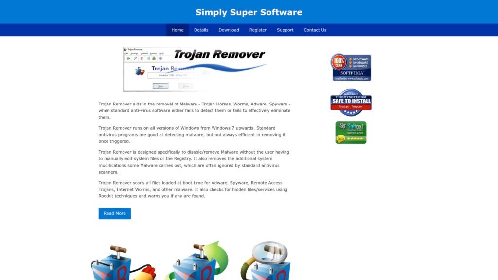 Descrição do site: O site da Simply Super Software, na página dedicada ao Trojan Remover, exibe de modo direto a proposta do programa: eliminar malwares — como trojans, worms, adware e spyware — mesmo quando antivírus convencionais falham. Ele explica que o software opera em versões do Windows desde o 7 e é capaz de desativar ou remover ameaças sem exigir do usuário intervenções manuais nos arquivos do sistema ou no registro. Também relata sua capacidade de detectar modificações mais sutis inseridas por malwares, inclusive aquelas que permanecem ocultas como rootkits. A página mistura texto descritivo com capturas de tela da interface e selos de confiabilidade como “Certified Safe to Install” de portais de download. Há ainda navegação fácil para seções como detalhes, download, registro e suporte, com menção explícita às políticas de privacidade e direitos autorais.