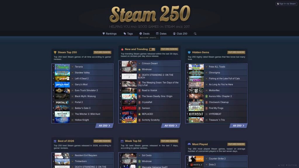 Descrição do site: O site Steam250 é uma plataforma online dedicada a ajudar jogadores a descobrir bons jogos disponíveis na Steam, funcionando como um sistema de rankings baseado em avaliações reais dos usuários. A proposta principal do site é organizar e destacar os melhores jogos a partir de dados como número de reviews e porcentagem de avaliações positivas, oferecendo uma visão mais qualitativa do que apenas vendas. A página apresenta diversas listas, como o “Top 250” melhores jogos de todos os tempos, jogos mais populares da semana, títulos em promoção e até categorias específicas como “hidden gems”, que destacam jogos pouco conhecidos, mas bem avaliados. O site também inclui rankings por gênero, preço e lançamentos recentes, facilitando a descoberta de novos títulos. Outro ponto importante é o uso de algoritmos próprios que combinam quantidade de avaliações e taxa de aprovação para classificar os jogos de forma equilibrada. Essas listas são atualizadas frequentemente, acompanhando mudanças nas avaliações dos jogadores ao longo do tempo. A plataforma não vende jogos, funcionando apenas como uma ferramenta de análise e recomendação. A interface é simples e direta, focada em rankings e dados organizados, sem distrações. No geral, o Steam250 funciona como um hub inteligente para descobrir jogos de qualidade na Steam, sendo especialmente útil para quem quer encontrar títulos bem avaliados, comparar opções e explorar novidades além dos jogos mais populares.