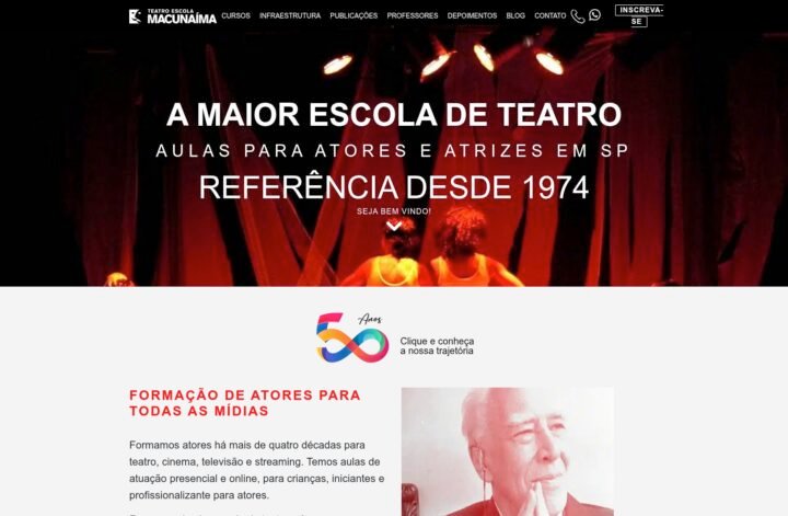 Descrição do site: O site Teatro Escola Macunaíma apresenta uma instituição dedicada à formação de atores, com forte tradição no ensino das artes cênicas no Brasil. A plataforma destaca a escola como uma das mais antigas e reconhecidas na área, fundada em 1974, e voltada à preparação de profissionais para teatro, cinema, televisão e streaming. O conteúdo do site enfatiza uma abordagem prática de ensino, baseada principalmente no Sistema Stanislavski, amplamente utilizado na formação de atores. Além disso, o portal organiza seus cursos em diferentes níveis, como iniciante, profissionalizante, infantil e pós-graduação, atendendo desde quem busca desenvolvimento pessoal até quem deseja seguir carreira artística. Também são oferecidas modalidades presenciais e online, ampliando o acesso ao aprendizado. O site apresenta a estrutura da escola, incluindo salas especializadas e teatros próprios, reforçando a proposta de aprendizagem prática e imersiva. Outro destaque é a produção de conhecimento científico na área teatral, com pesquisas, publicações e iniciativas acadêmicas voltadas ao estudo da atuação. De forma geral, a plataforma transmite a imagem de uma instituição consolidada, que combina tradição, prática artística e pesquisa, buscando desenvolver tanto habilidades técnicas quanto aspectos criativos e pessoais dos alunos por meio do teatro.