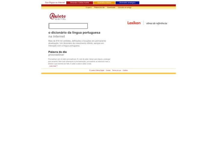 Descrição do site: O Aulete é a versão online do tradicional Dicionário Caldas Aulete, um dos dicionários de referência da língua portuguesa, que reúne um vasto acervo de verbetes, definições e locuções da língua em constante atualização e consulta gratuita na internet. O site funciona como uma ferramenta de pesquisa onde o usuário pode digitar palavras para obter seus significados, classes gramaticais e contextualizações, servindo tanto para estudantes quanto para profissionais e curiosos pela língua. Além das entradas léxicas, oferece seções auxiliares como gramática básica, dicionário analógico e “palavra do dia”, ampliando a experiência de aprendizado. A plataforma é mantida com atualizações permanentes e procura refletir as transformações e usos contemporâneos do português, integrando recursos que ajudam a compreender mais profundamente o vocabulário. A interface, ainda que simples, prioriza a clareza e a rapidez na consulta, com textos explicativos e exemplos que facilitam o entendimento dos termos. O projeto por trás do Aulete também contempla evolução tecnológica, buscando reinventar o conceito tradicional de dicionário e permitir a participação dos usuários em propostas de inclusão e discussão de verbetes.