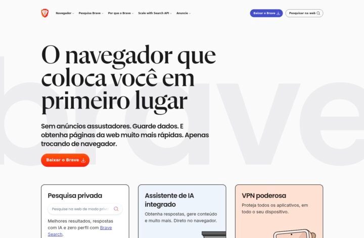 Descrição do site: O site do Brave apresenta-se como uma plataforma focada em privacidade, desempenho e autonomia do usuário na navegação. O navegador é promovido como “o navegador que coloca você em primeiro lugar”, destacando bloqueio automático de anúncios invasivos, proteção contra rastreadores e um mecanismo de busca próprio, “Brave Search”, que não cria perfil do usuário. Há também ofertas de serviços pagos, como VPN/firewall (“Brave Firewall + VPN”), carteira de ativos digitais, e um assistente de IA integrado chamado Leo. O layout é claro e moderno, com chamadas visuais fortes para download em múltiplas plataformas (computador, Android, iOS) e explicações diretas de benefícios como economia de dados, bateria e tempo. O site enfatiza que muitos dos recursos já vêm ativados por padrão, reduzindo a necessidade de configuração manual. Também há comparações com outros navegadores para mostrar onde o Brave se diferencia, além de seções de apoio com perguntas frequentes, blog, atualizações de privacidade e documentação relevante. A comunicação reforça valores de transparência e controle do usuário em vez de monetização via coleta de dados.