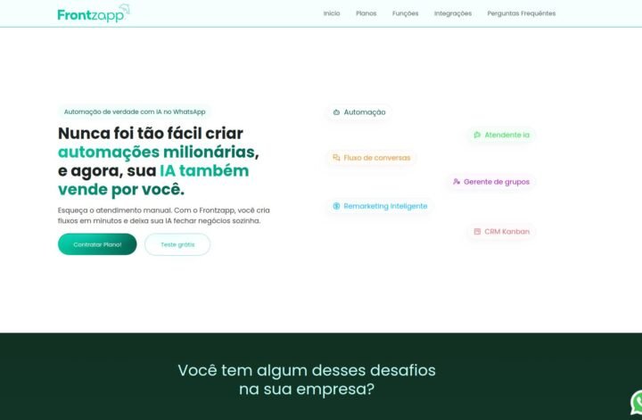 Descrição do site: O site Frontzapp apresenta uma plataforma de automação e vendas via WhatsApp com uso de inteligência artificial, voltada para empresas e empreendedores que desejam transformar o atendimento e o funil de vendas em processos automatizados e escaláveis. Na página principal, a proposta é simplificar o atendimento manual criando fluxos inteligentes que respondem, qualificam e convertem clientes automaticamente, além de permitir disparos em massa de mensagens e integração com múltiplos números de WhatsApp. A interface oferece ferramentas como construtor de fluxos visuais, CRM com visão em Kanban, rastreamento de anúncios e suporte 24 h por IA, tudo acessível tanto no computador quanto no celular, com planos e testes gratuitos destacados. A plataforma se posiciona como solução completa para quem busca otimizar relacionamentos, reduzir custos com equipe e aumentar conversões sem necessidade de programação avançada. O site também inclui informações sobre planos de preços, integração com outras ferramentas e perguntas frequentes para novos usuários. A empresa por trás do serviço, Frontzapp LTDA, está registrada em São Paulo e atua no mercado de automações e soluções digitais desde 2025.