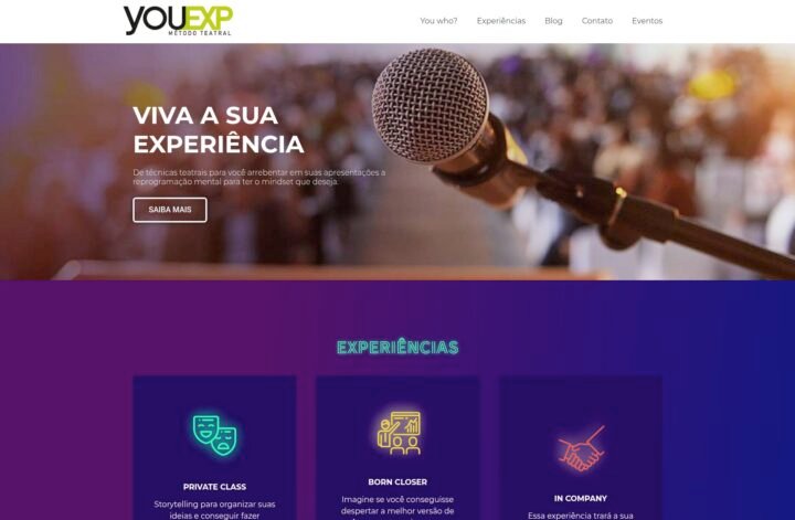 Descrição do site: O site YouExp é uma plataforma brasileira focada no desenvolvimento pessoal e profissional por meio de experiências imersivas de aprendizagem. Sua proposta central é unir educação e prática, utilizando metodologias diferenciadas, como técnicas teatrais, storytelling e conceitos de neurociência para aprimorar habilidades de comunicação e comportamento. A plataforma oferece cursos, treinamentos e eventos voltados principalmente à oratória, liderança e autoconhecimento. Um dos principais diferenciais do site é o chamado “método teatral”, que busca tornar o aprendizado mais dinâmico e vivencial, incentivando o aluno a desenvolver confiança e presença em apresentações e interações profissionais. Além dos cursos individuais, a YouExp também oferece treinamentos corporativos personalizados para empresas, com foco em melhorar a comunicação e o desempenho de equipes. A plataforma ainda disponibiliza eventos, workshops e conteúdos em blog, abordando temas como carreira, linguagem corporal e técnicas de fala em público. Com uma abordagem prática e voltada à transformação pessoal, o site se posiciona como uma alternativa inovadora para quem deseja desenvolver habilidades interpessoais e se destacar no ambiente profissional.