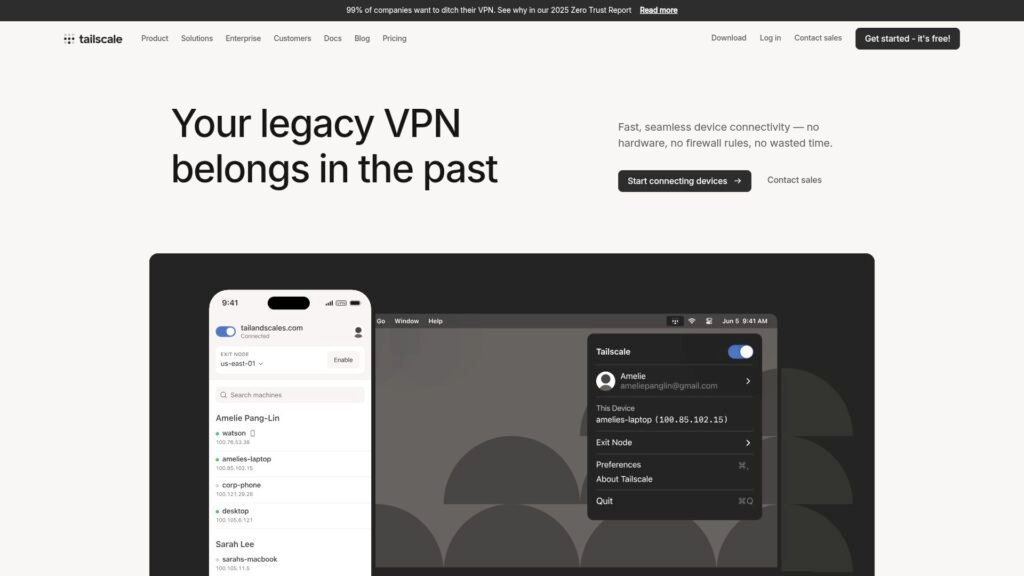 Descrição do site: O site Tailscale exibe uma proposta moderna de redes privadas seguras, oferecendo uma plataforma que conecta dispositivos por meio de redes ponto a ponto com criptografia robusta. Ele enfatiza uma arquitetura sem hardware adicional ou regras complexas de firewall, eliminando a necessidade de VPNs convencionais. A página explica como o sistema coordena ligações com um plano de controle centralizado, mas mantém o tráfego distribuído entre os nós para melhor desempenho. Além disso, destaca recursos como controle de acesso granular, integrações com provedores de identidade, registro de auditoria e roteamento entre redes locais. O site também oferece documentação técnica, casos de uso e guias de configuração para diferentes ambientes. A proposta é tornar redes privadas mais simples, seguras e escaláveis, ajustando‑se tanto a uso pessoal quanto corporativo.