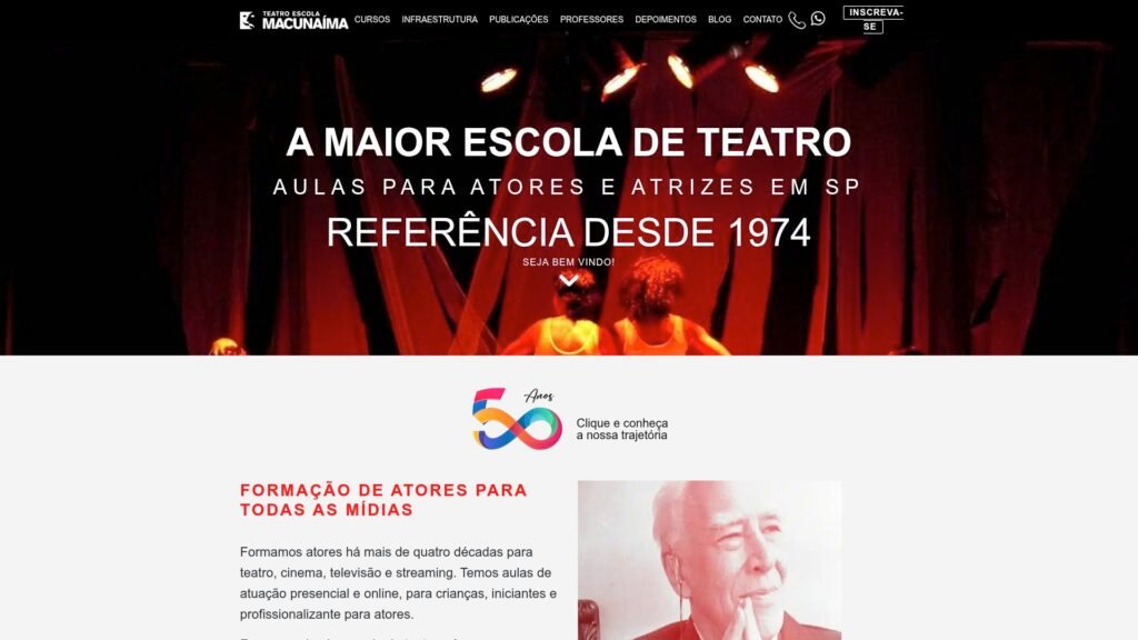 Descrição do site: O site Teatro Escola Macunaíma apresenta uma instituição dedicada à formação de atores, com forte tradição no ensino das artes cênicas no Brasil. A plataforma destaca a escola como uma das mais antigas e reconhecidas na área, fundada em 1974, e voltada à preparação de profissionais para teatro, cinema, televisão e streaming. O conteúdo do site enfatiza uma abordagem prática de ensino, baseada principalmente no Sistema Stanislavski, amplamente utilizado na formação de atores. Além disso, o portal organiza seus cursos em diferentes níveis, como iniciante, profissionalizante, infantil e pós-graduação, atendendo desde quem busca desenvolvimento pessoal até quem deseja seguir carreira artística. Também são oferecidas modalidades presenciais e online, ampliando o acesso ao aprendizado. O site apresenta a estrutura da escola, incluindo salas especializadas e teatros próprios, reforçando a proposta de aprendizagem prática e imersiva. Outro destaque é a produção de conhecimento científico na área teatral, com pesquisas, publicações e iniciativas acadêmicas voltadas ao estudo da atuação. De forma geral, a plataforma transmite a imagem de uma instituição consolidada, que combina tradição, prática artística e pesquisa, buscando desenvolver tanto habilidades técnicas quanto aspectos criativos e pessoais dos alunos por meio do teatro.