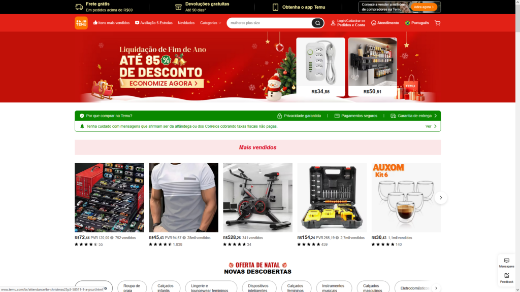 Descrição do site: Site oficial da Temu, um marketplace global de comércio eletrônico pertencente ao grupo chinês PDD Holdings, lançado em 2022 e presente em dezenas de países com um modelo que conecta consumidores a milhões de vendedores e fabricantes oferecendo produtos a preços muito baixos. A plataforma reúne uma enorme variedade de categorias — incluindo moda, eletrônicos, itens para casa, beleza e acessórios — com promoções frequentes, opções de pagamento em reais e envio ao Brasil direto de parceiros internacionais ou em alguns casos de estoques locais. O apelo principal do Temu é o preço competitivo, muitas vezes bem inferior ao de marketplaces tradicionais, o que atrai compradores em busca de descontos substanciais. Apesar disso, em vários mercados a experiência pode variar conforme o vendedor, existindo relatos de prazos de entrega longos, qualidade dos produtos diversa e necessidade de atenção às avaliações das ofertas antes da compra. O site funciona tanto pelo navegador quanto por meio de um aplicativo, e costuma oferecer campanhas, cupons e frete gratuito para estimular o uso frequente da plataforma. Em suma, o Temu no Brasil é uma opção de compras online com foco em variedade e preços baixos, mas que exige cuidado na escolha de vendedores e atenção às políticas de envio e devolução.