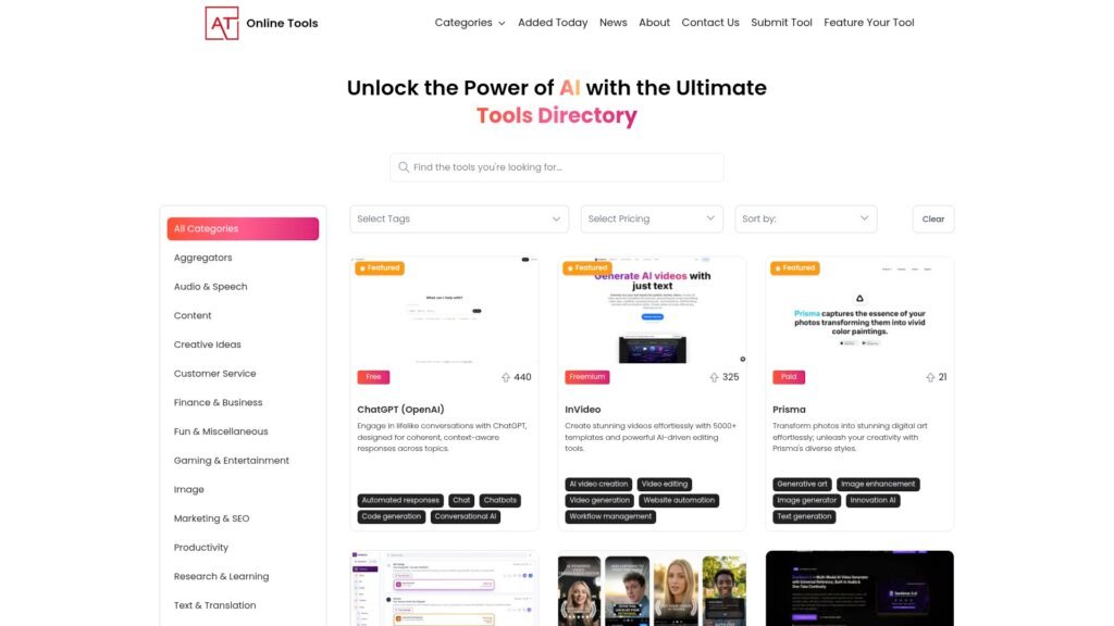 Descrição do site: O site Tools AI Online funciona como um diretório completo de ferramentas de inteligência artificial, reunindo centenas de soluções listadas em categorias distintas para facilitar a descoberta e comparação de recursos de IA em um só lugar. A página principal permite filtrar por tipo de ferramenta, preço e finalidade, exibindo desde ferramentas populares como ChatGPT até opções específicas de criação de vídeos, geração de imagens e automação de tarefas, com detalhes básicos e links diretos para os serviços listados. O site também oferece assinaturas de newsletter para receber atualizações regulares sobre novidades em IA e uma seção para desenvolvedores ou criadores enviarem suas ferramentas para inclusão no catálogo. Além disso, há páginas institucionais que explicam o propósito do diretório, opções de contato e diretrizes para submissão, mostrando um esforço em manter o conteúdo organizado e relevante para quem busca explorar o ecossistema de inteligência artificial.