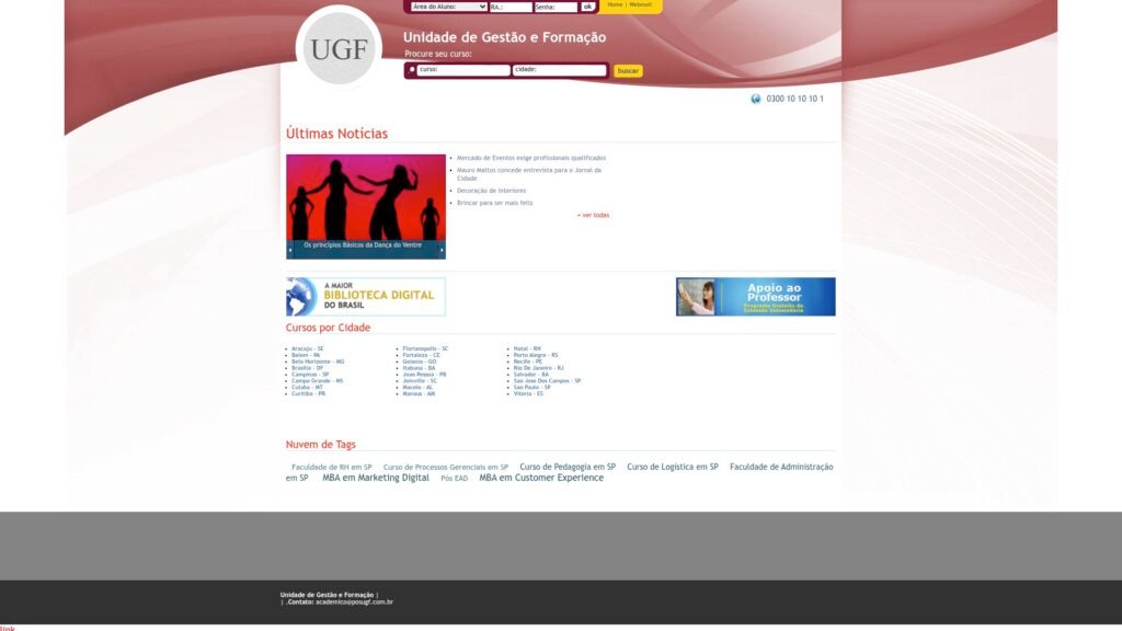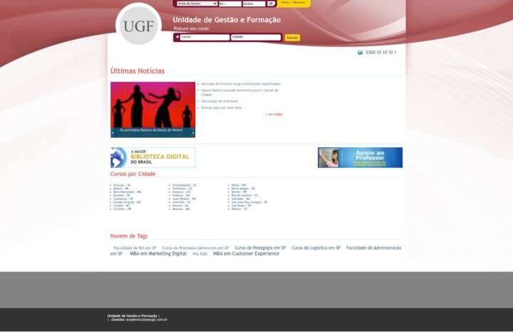 Descrição do site: Plataforma da Unidade de Gestão e Formação (UGF), vinculada à Universidade Gama Filho, voltada à oferta de cursos de pós-graduação, MBA e extensão em diversas áreas do conhecimento. O portal apresenta uma proposta educacional focada na qualificação profissional, com opções de cursos tanto presenciais quanto a distância, atendendo diferentes perfis de estudantes. A plataforma organiza seus cursos por áreas e também por cidades, mostrando uma ampla atuação em diversas regiões do Brasil, o que amplia o alcance da instituição. O site destaca formações voltadas para áreas como gestão, educação, saúde e negócios, com foco no desenvolvimento de competências práticas e teóricas. Outro ponto importante é a ênfase na atualização profissional, acompanhando tendências do mercado e oferecendo conteúdos alinhados às demandas atuais. A UGF também ressalta sua experiência na oferta de cursos de especialização ao longo de décadas, reforçando sua credibilidade no ensino superior. Além disso, o site disponibiliza informações institucionais, notícias, galeria de eventos e detalhes sobre locais de realização dos cursos, facilitando o acesso às informações pelos alunos. De forma geral, o portal se apresenta como um ambiente educacional completo, voltado à formação continuada e ao crescimento profissional em diferentes áreas.