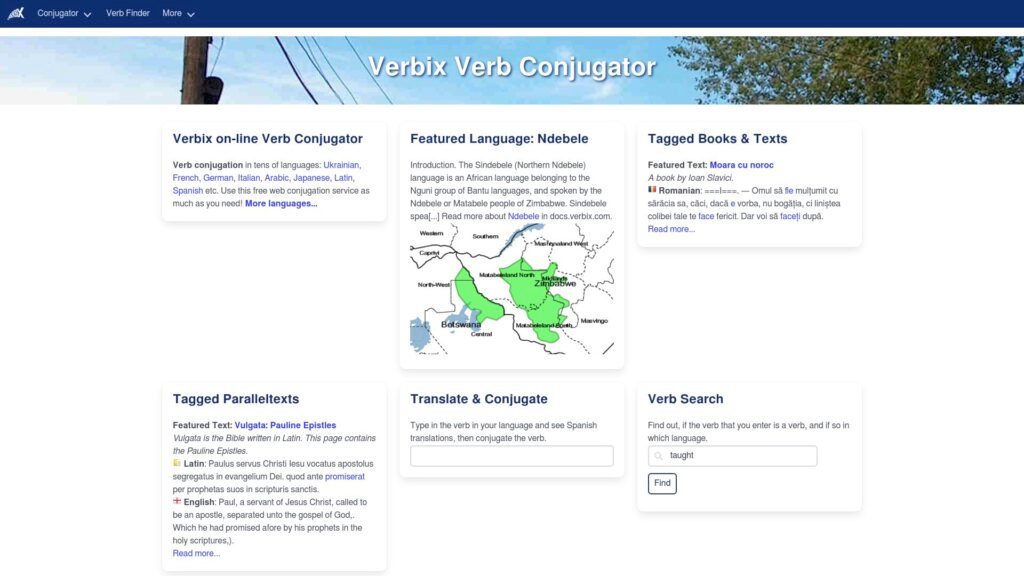 Descrição do site: O site Verbix é um conjugador de verbos online focado em exibir as formas conjugadas de verbos em dezenas de línguas, servindo como uma ferramenta prática para estudantes, professores ou curiosos que querem ver como um verbo se flexiona em diferentes tempos, modos e pessoas. Ele permite digitar um verbo e obter uma tabela completa de conjugações para línguas como espanhol, francês, italiano, alemão, japonês e muitas outras, incluindo opções menos comuns e até alguns idiomas regionais ou históricos. O serviço é oferecido gratuitamente e complementa sua função com informações auxiliares como textos exemplares e materiais linguísticos extras. O projeto Verbix também está ligado a uma organização sem fins lucrativos que visa promover a diversidade linguística e está disponível tanto na versão web quanto como software para sistemas como Windows. A interface é simples e objetiva, focada na rapidez da consulta, tornando o site útil para quem estuda línguas estrangeiras ou precisa de uma referência rápida de formas verbais sem recorrer a gramáticas impressas.