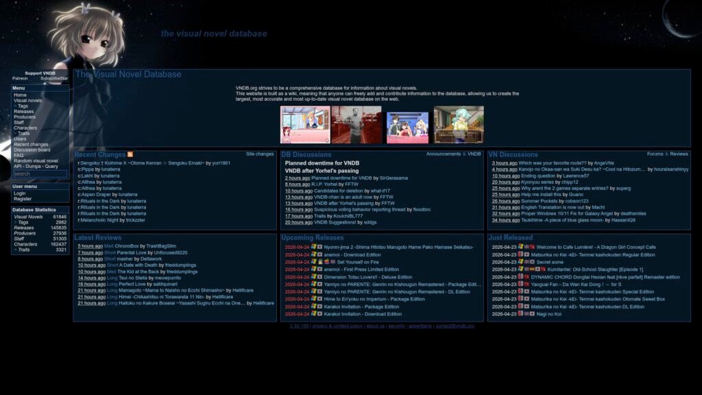 Descrição do site: O site VNDB é uma plataforma online dedicada ao catálogo e organização de visual novels, um tipo de jogo focado em narrativa interativa. Ele funciona como um grande banco de dados colaborativo, reunindo informações detalhadas sobre milhares de títulos, incluindo dados como enredo, desenvolvedores, datas de lançamento, plataformas e idiomas disponíveis. Além do aspecto informativo, o site permite que usuários criem contas para montar listas pessoais, avaliar obras e acompanhar o que já jogaram ou pretendem jogar, de forma semelhante a serviços como MyAnimeList, mas voltado exclusivamente para esse gênero. A plataforma também possui um sistema avançado de tags, que ajuda a classificar os jogos por temas, estilos narrativos e características específicas, facilitando a descoberta de novas obras conforme o interesse do usuário. Outro destaque é a presença de fóruns e espaços de discussão, onde a comunidade pode trocar opiniões, recomendações e análises sobre diferentes visual novels. Isso transforma o site não apenas em um catálogo, mas também em um ambiente social para fãs do gênero. O VNDB não hospeda jogos para download, atuando apenas como fonte de informação e referência, muitas vezes incluindo links para lojas oficiais ou conteúdos relacionados. De forma geral, o site se consolidou como uma das principais referências globais sobre visual novels, sendo amplamente utilizado tanto por jogadores quanto por desenvolvedores e pesquisadores interessados nesse tipo de mídia.