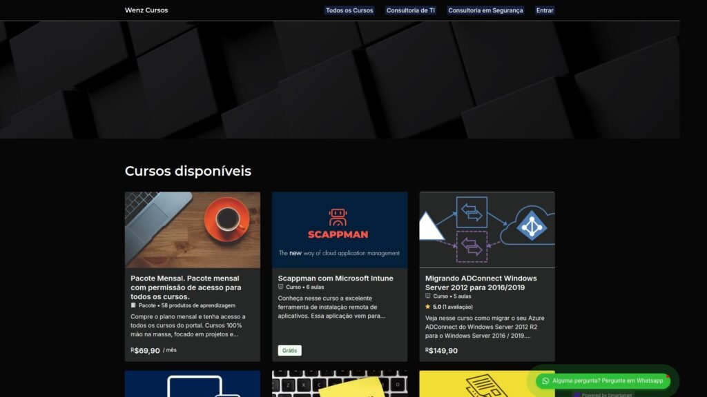 Descrição do site: O site da Wenz Cursos se posiciona como uma plataforma de especialização prática para profissionais de TI, com foco em infraestrutura, segurança da informação e tecnologias Microsoft. A navegação mostra ofertas variadas: desde cursos gratuitos até pacotes mensais que dão acesso a todo o catálogo, com ênfase em “mão na massa” e cenários reais de aplicação. O design do site privilegia clareza nos valores e avaliações (média de 5,0 em muitos cursos) e descreve faixas de preço, número de aulas e perfil do público-alvo, o que reforça transparência. Além disso, a plataforma destaca a assinatura mensal como opção para acesso amplo ao conteúdo, o que indica um modelo de aprendizagem contínua. Em resumo, o portal funciona como um centro de capacitação técnica para quem já atua ou deseja ingressar em TI, oferecendo conteúdo relevante, especializado e acessível para o mercado profissional.