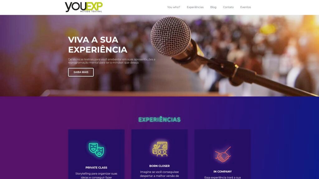 Descrição do site: O site YouExp é uma plataforma brasileira focada no desenvolvimento pessoal e profissional por meio de experiências imersivas de aprendizagem. Sua proposta central é unir educação e prática, utilizando metodologias diferenciadas, como técnicas teatrais, storytelling e conceitos de neurociência para aprimorar habilidades de comunicação e comportamento. A plataforma oferece cursos, treinamentos e eventos voltados principalmente à oratória, liderança e autoconhecimento. Um dos principais diferenciais do site é o chamado “método teatral”, que busca tornar o aprendizado mais dinâmico e vivencial, incentivando o aluno a desenvolver confiança e presença em apresentações e interações profissionais. Além dos cursos individuais, a YouExp também oferece treinamentos corporativos personalizados para empresas, com foco em melhorar a comunicação e o desempenho de equipes. A plataforma ainda disponibiliza eventos, workshops e conteúdos em blog, abordando temas como carreira, linguagem corporal e técnicas de fala em público. Com uma abordagem prática e voltada à transformação pessoal, o site se posiciona como uma alternativa inovadora para quem deseja desenvolver habilidades interpessoais e se destacar no ambiente profissional.